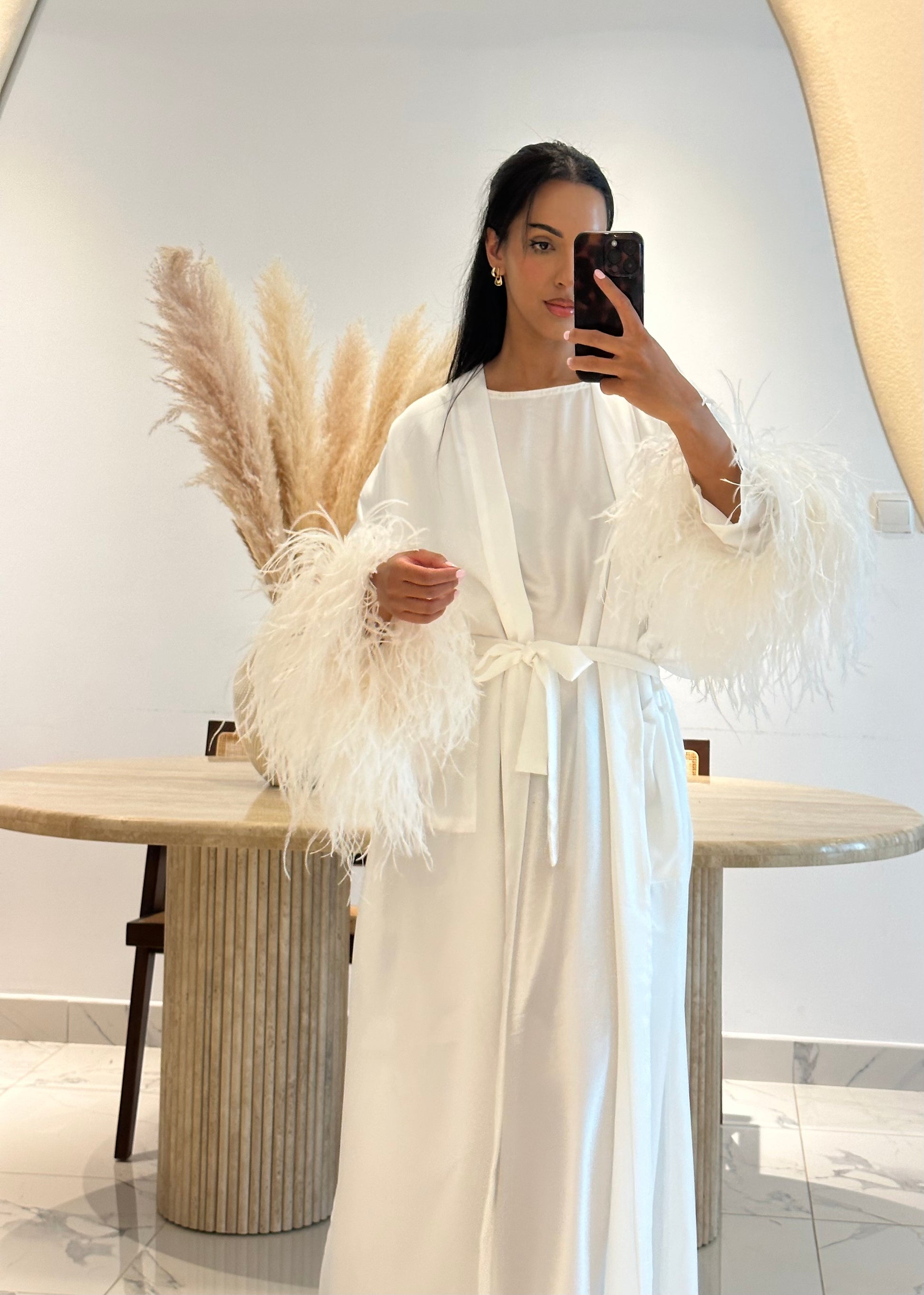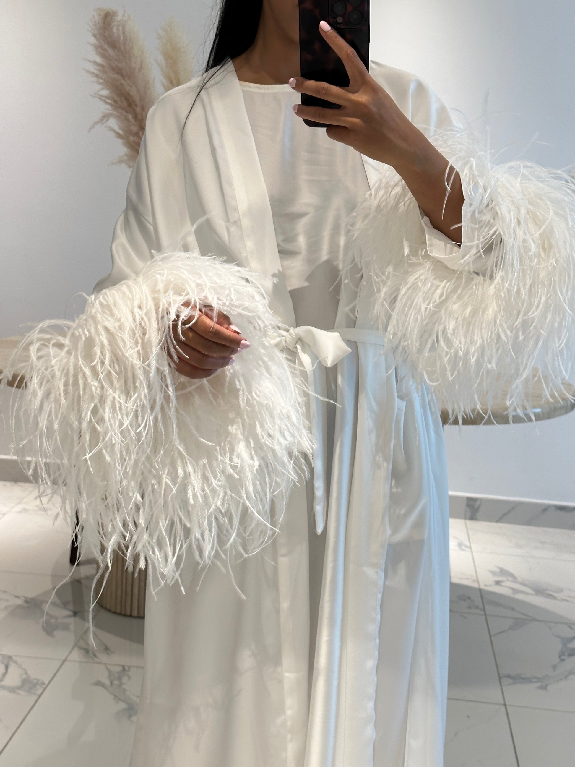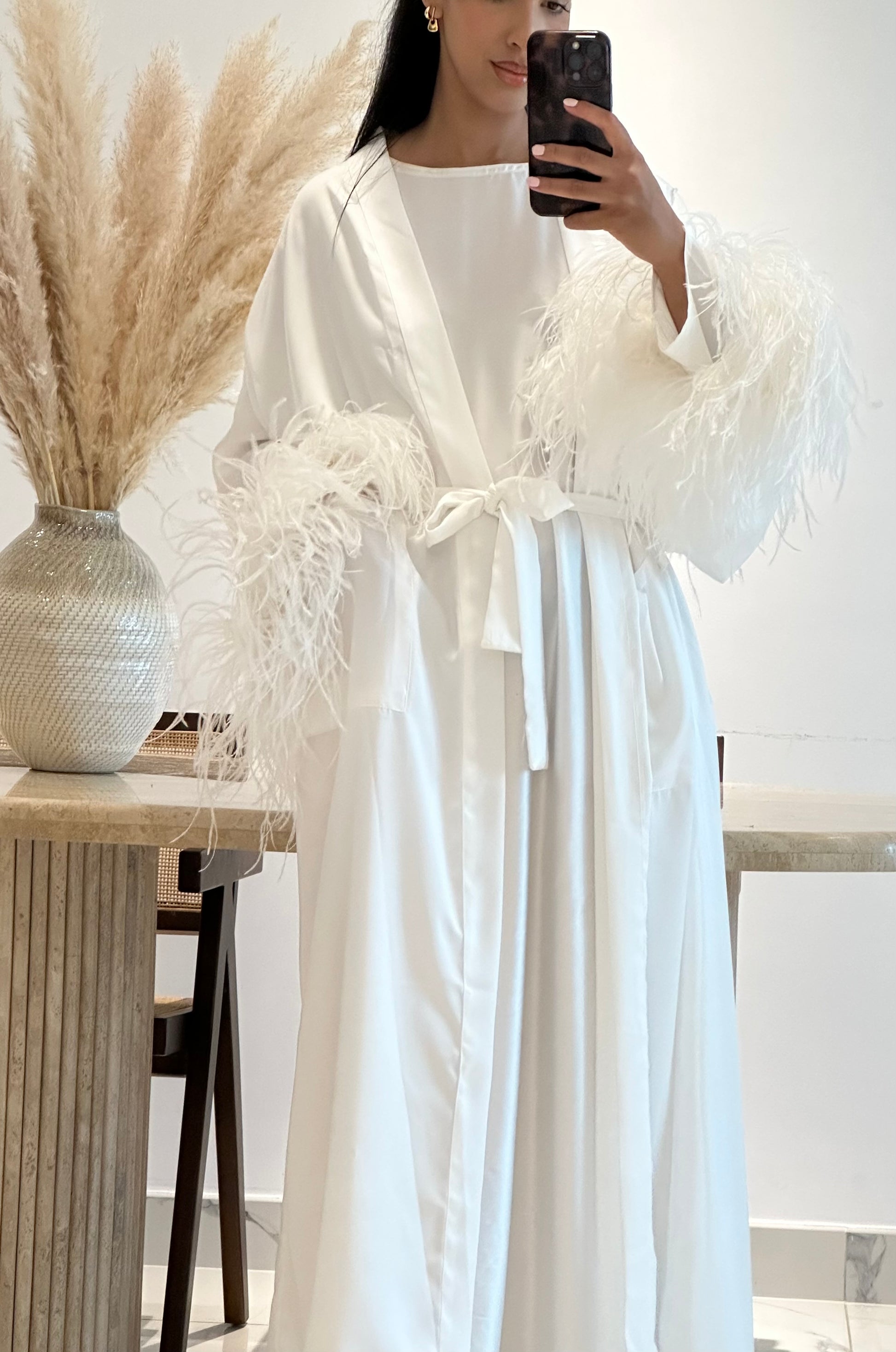 Our feather abaya, crafted from luxurious crepe satin and adorned with premium ostrich feathers, will elevate your wardrobe and make a statement wherever you go.