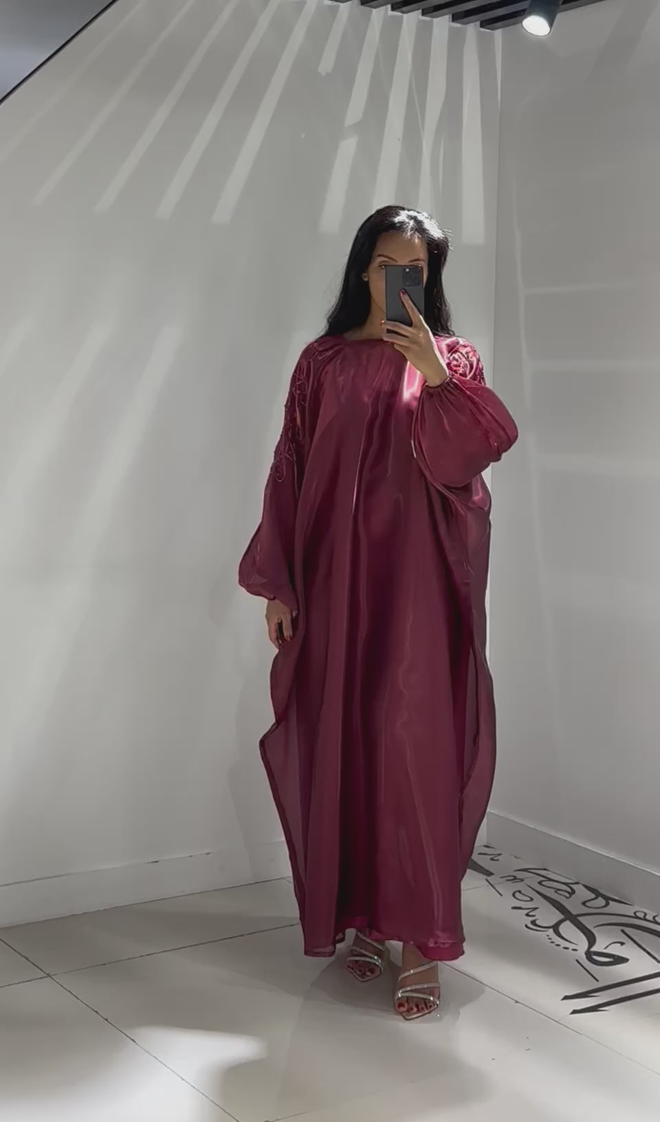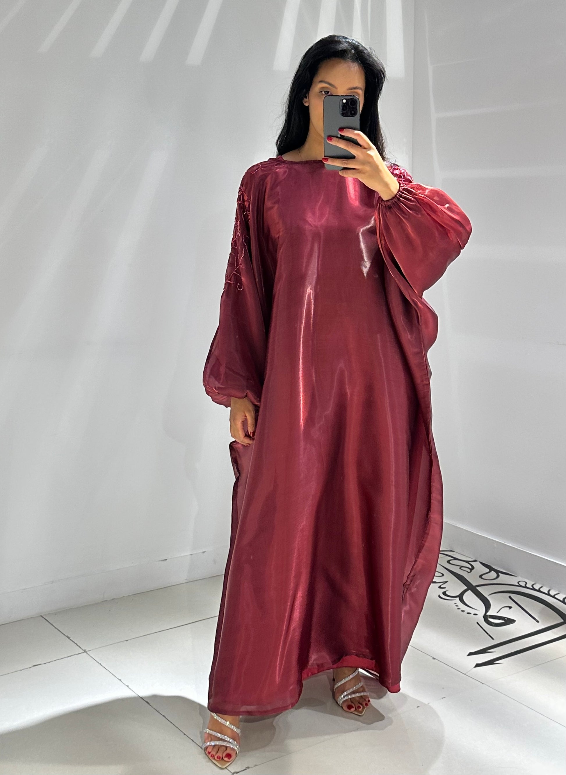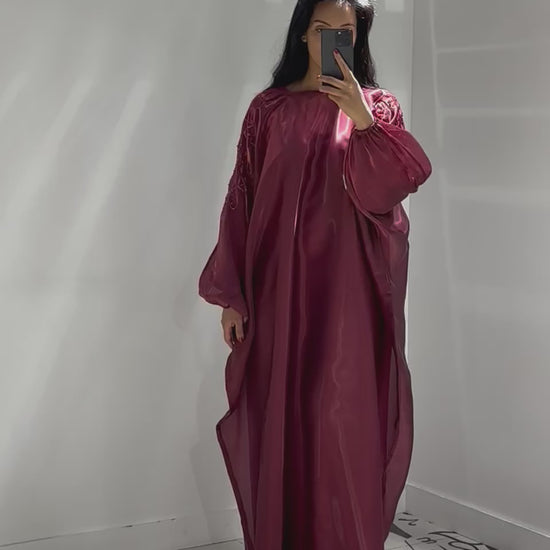 The Hajra Jalabiya consists of a satin dress with long sleeves, complemented by a matching organza dress adorned with hand-embellished beadwork on the shoulders and sleeves.