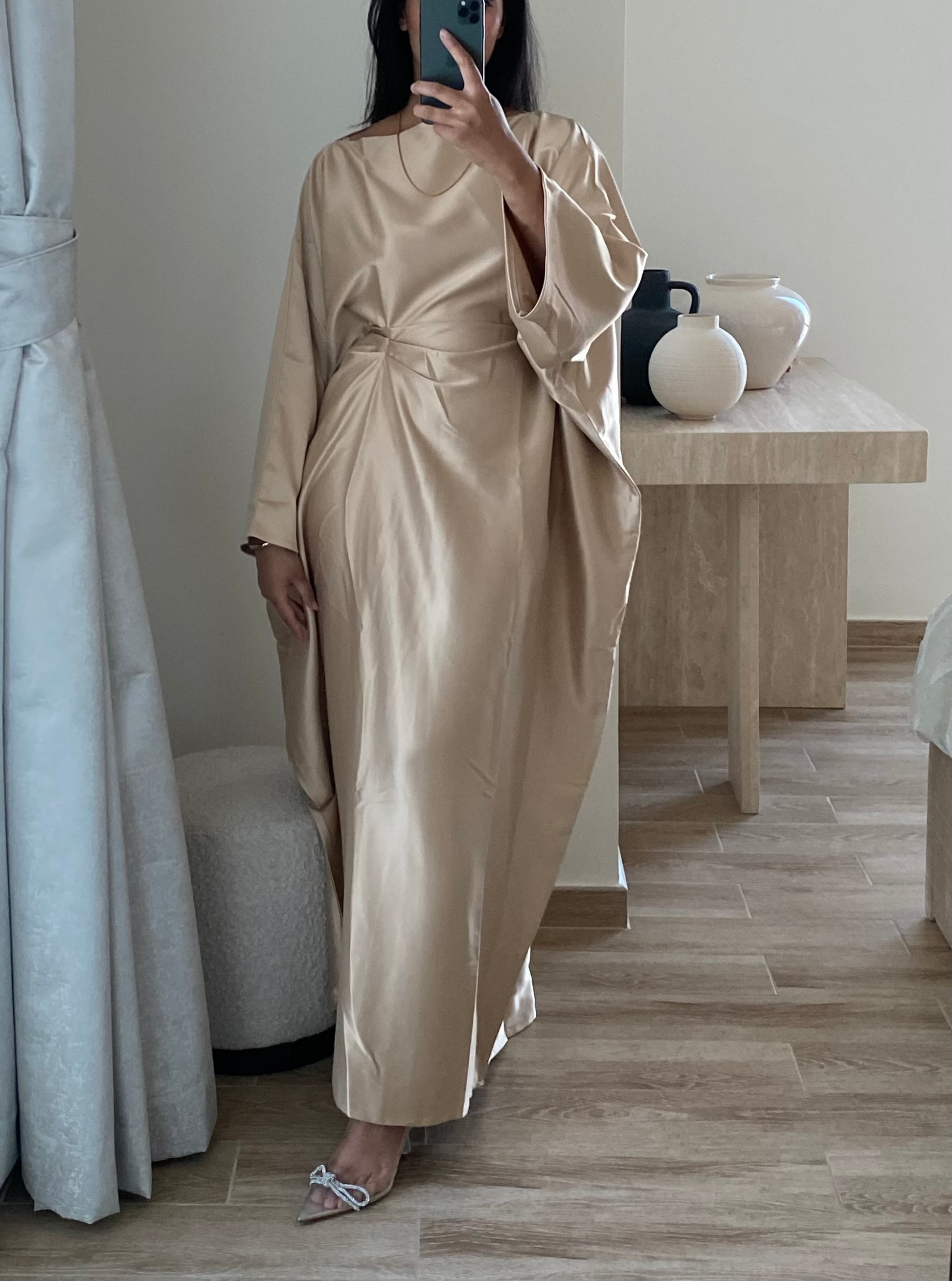 Please note the neckline for the current stock of beige kaftan is a rounded neck (as with our metal kaftan) as opposed to that pictured.